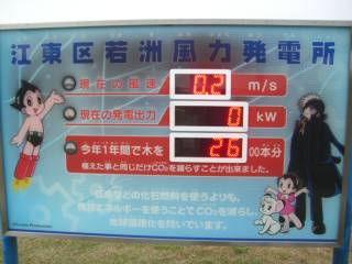 There was a board which wind velocity and quantity of generation nearby this windmill. The board shows how reduce the CO2. When I looked this board,quantity of generation was empty. Because the wind was breeze. |