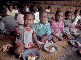 モザンビーク(Mozambique) ■とくちょう この国はWFP(国連世界食糧計画)から配給をうけています。 この学校給食の配給がかれらにとって、一日の生活の中でえいよう価の一番たかいしょくじです。 このような学校給食の配給は、子どもたちのけんこうとえいよう状たいを向上させ、おなかがみたされればこどもたちは学習に集中することができます。 WFPが学校で配給する給食は、子どもたちを飢え(うえ)から救い、教育のきかいをひろげています。 アフリカ大陸にもどる 世界地図にもどる トップにもどる