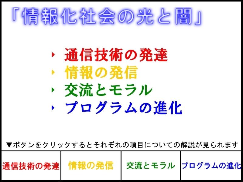 このサイトは「第13回全日本中学高校WebコンテストThinkQuest JAPAN」にエントリーしております。このサイトでは全体を ●「通信技術の発達」 ●「情報の発信」 ●「交流とモラル」 ●「ブログラムの進化」 の4つのテーマに分けて構成しており(詳しくはサイトマップをご覧ください)、各テーマのトップには各ページ上に設置されているメニューボタンから移動することができます。 文章のページではこの色の単語の上にマウスを置くとその単語についての説明が見られます。 推奨環境