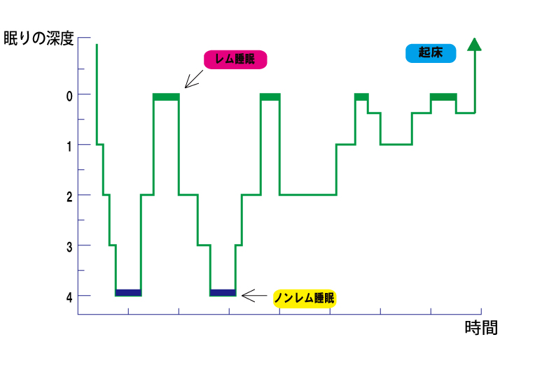 眠りに入ってから徐々にノンレム睡眠に入っていきます。 1時間経つ頃には逆に眠りが少しずつ浅くなり、眠り始めてから約90分後にレム睡眠に入ります。 レム睡眠には時間があり、最初は約10分間ほど持続し、これを90分周期で繰り返し、明け方に近くなるほど長くなって、最大で20分程度持続するようになります。