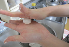 | A粉とお湯がなじんだら、だんご状にくるくる丸める。 |