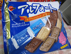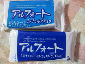 アルフォート 香ばしいビスケットと甘いチョコレートが特徴です。 ビスケットには全粒粉がはいっているのでほかのビスケットにはない香りが楽しめます。 上のチョコレートには帆船が書かれていてデザインもかわいいです。 |