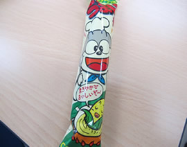 うまい棒 棒状のお菓子で、たくさんの味があるのが特徴です。 10円という手ごろな価格も人気の秘訣です。 |