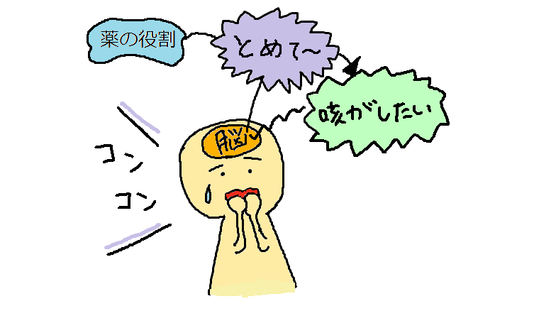 このお薬は、咳中枢と呼ばれる脳の咳のコントロール部分を抑えこむことで咳をおさめる作用があります。
