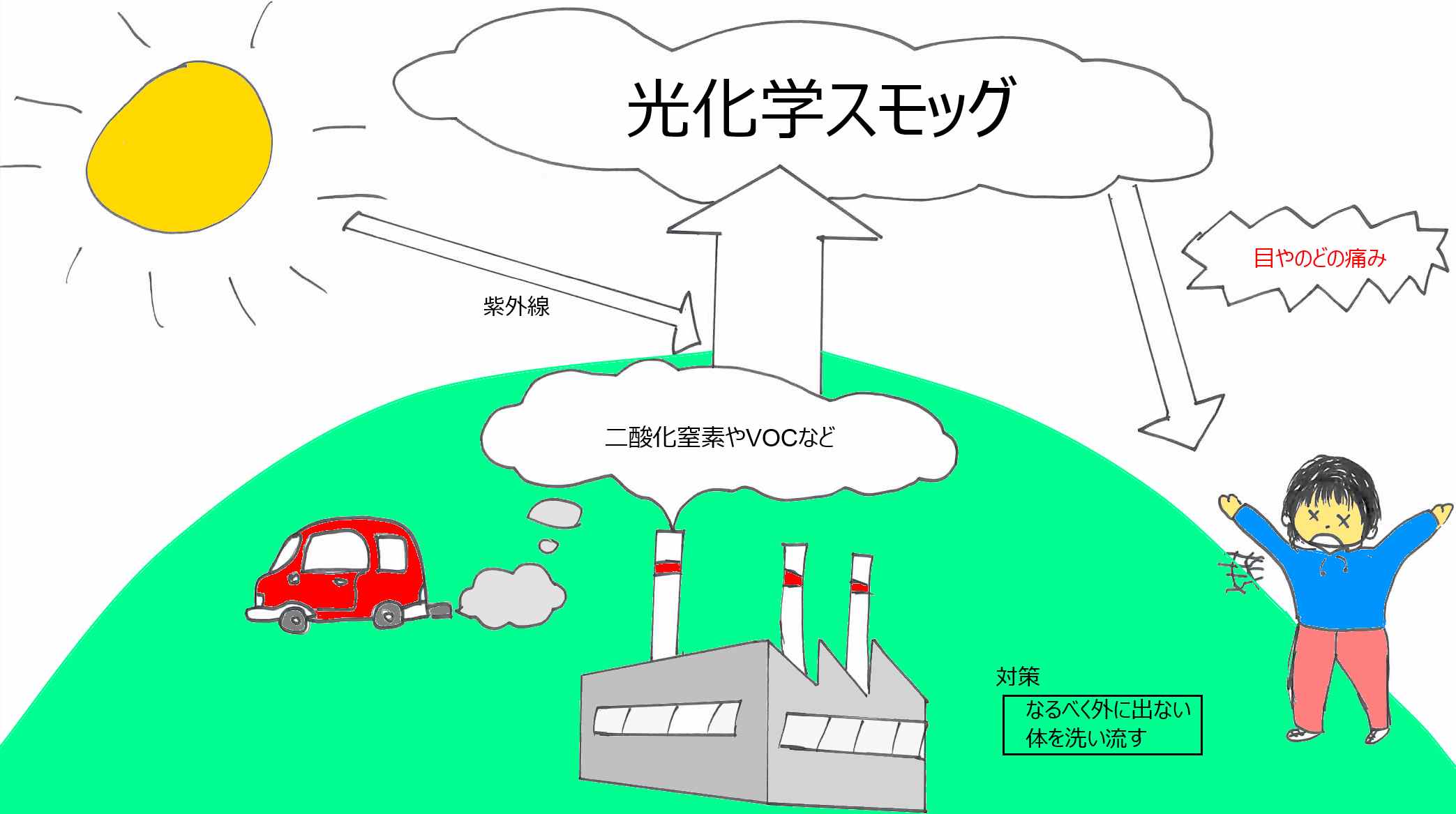 また、光化学スモッグが発生しているときに外出した場合は、光化学オキシダントなどの汚染物質が