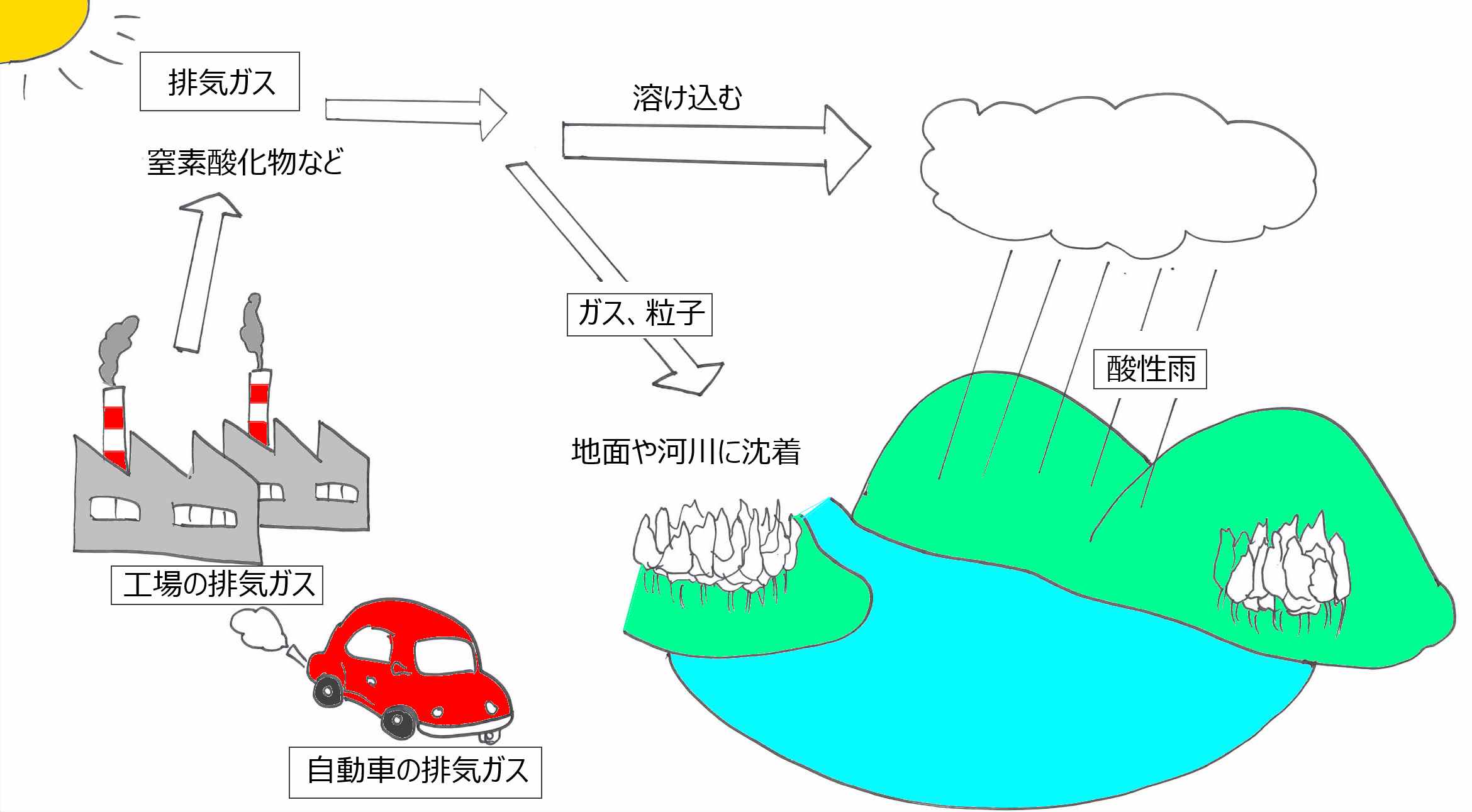 工場、火力発電所、自動車の排気ガスに含まれる窒素酸化物,硫黄酸化物や塩化水素などが空気中の水や酸素と反応して、