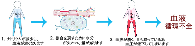 ・循環不全 血漿中のナトリウムや塩素が不足するため細胞外液の濃さが低下しますが、体は下がった濃度を正常に戻そうとするので、水分を体外に出します。これによって血しょうの量が減って血液が濃縮するので、各臓器への血流の量が少なくなります。こうして体に流れる血液の量が減ると、血圧低下や循環不全が起こります。 この血液循環不全は生物にとってまず防がなければいけない状態です。人間は食物を食べなくても2か月を生き延びることができますが、ナトリウムが腎臓から一日に0.5g以上減ると、人間はすぐに死んでしまいます。 ・けいれん、神経障害 ナトリウムが不足すると、人間の神経伝達と筋肉の動きに大きな支障が出ます。これは過剰摂取のときに起こるよりも深刻で、必要量から不足するだけですぐにけいれんが起こるうえ、同時に低血圧やめまい、神経障害も起きるため場合によっては直接命に関わります。 |