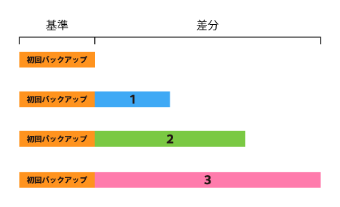 初回バックアップ(フルバックアップ)をベースに増えた分の全てのファイル、データをすべてバックアップする仕組みになっています。