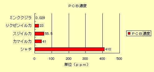 イルカの仲間にシャチがいる。シャチは食糧としてイカ類や魚類だけでなく、時にはイルカや鯨を襲って食べる。このことから「キラーホエール」とも呼ばれている。「キラーホエール」とは海洋生物の食物連鎖の頂点に立つ動物で、海の殺し屋という意味である。そのため、シャチのPCB濃度は他の動物をはるかに凌駕するものとなった。(下のグラフより)