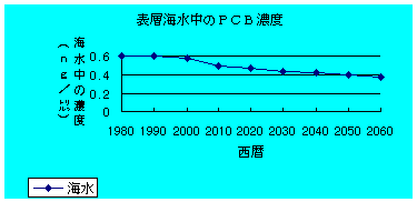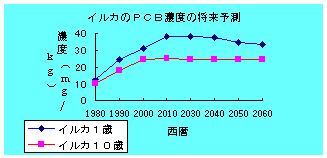 グラフを見ると、海水中のPCB濃度は徐々に低下しているが、イルカのPCB濃度は上昇してからほとんど低下しない状態が続く。グラフより、子供のほうが大人のイルカよりも汚染されているという事実が浮き上がる。