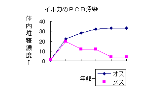 この謎を解くために立川教授は重金属とBHC,DDT,PCBなどの有機塩素系化合物の分析を行った。その結果、意外な事実が浮かび上がった。オスが年齢と共にPCBの蓄積濃度が増加していくのに対し、メスはある年齢から急激にPCBの蓄積濃度が低下していくという事実だった。(下のグラフ参照)