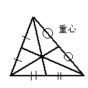 まず重心から。 三角形のとある頂点から対辺(その角が触れてない辺。 例えば△ABCで輸の対辺はBC)の中点に引いた線を中線と呼ぶが、 三角形においては中線は三つ存在する。この三つの中線は一点で交わり、 しかもこの交点はそれぞれの中線を図のように1:2に内分する。 この交点のことを重心とよぶ。ちなみに重心という言葉は数学に限らず聞く 言葉だと思うが、三角形の板があったときこの重心の部分だけを支えれば この三角形の板は落ちることがないというありがたい点である。