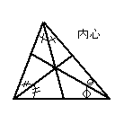 次に内心。 三角形には三角形の内部にあり、三角形の三辺に接する円が存在する。 そしてこの内接円の中心が内心とよばれる。 実際三角形のなかに内接円がある図を見ると分かると思うが、 この内心という点、三角形の三辺から等距離にある点である。 (円の半径は常に一定だから)辺と辺から等距離にある点と聞いたら 何かを思い出さないだろうか。平面図形の説明のページにもあったが、 角の二等分線とはその角をなす二直線から等距離な点の集まりであった。 よって内心から三つの角に直線を引くとそれは皆角の二等分線になる。 逆に言うと三つの角の二等分線は一点で交わり、それが内心となる。