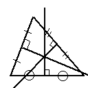 最後に外心。 三角形は必ず外接円というものも作れる。 外接円とはその円周が三角形の三つの頂点を全て通る円のことである。 そしてこの外接円の中心が外心と呼ばれる。円周というのは中心の点から 等距離な点の集まりだから、逆に見れば外心は三角形の三つの頂点から 等距離な点でもある。さてこれでまた思い起こさないだろうか。 内心では角の二等分線が出てきたが、外心は線分の垂直二等分線が関わってくる。 そもそも線分の垂直二等分線はその線分の両端の点から等距離な点の集まり であった。よって外心から三角形の三辺に垂線を下すと、その垂線の足は それぞれ三辺を二分する。逆に言うと三つの辺の垂直二等分線は一点で交わり、 それが外心となる。
