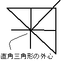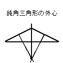 一応今まで説明した五心のうち三つについて位置について注意しておく。 重心というのは中線上にあるので三角形の内部にあり、 内心は三角形の内部にある内接円さらに内側にあるので当然三角形の内部にある。 が、外心においては三角形の種類によって違ってくる。 三角形が鋭角三角形だったら外心はその内部に、 三角形が鈍角三角形だったら外心は三角形の外側に、 そして三角形が直角三角形だったら外心はその斜辺の中点にくる。