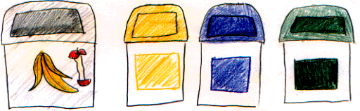 Y)ドイツの学校では、各教室にも、鮮やかに色分けされた分別箱が4つずつ置かれているんだって。それで、残ったごみを分別箱にきちんと