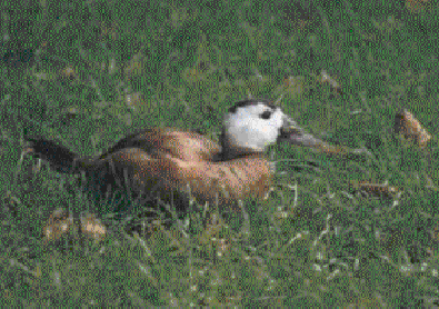 総固体数は14000羽と見積もられ ている。過去数十年に激減した。越冬 地での過度の狩猟圧や生息地の減少が 原因となっている。イギリス南部で飼 育下から逃げたアカオタテガモの群れ との交雑化がみられるのも、本種の未 来が暗くなっていることがわかる。