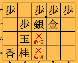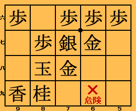 玉に隣接する二つのポイントが玉以外の駒の守備範囲にはいっていません。しかも前面にでている金・銀も後ろからの支えがなくなり非常にもろくなっています。もうこうなってしまうと、壊滅に近い状態です。