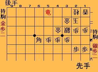 上の説明を参考に攻め立てる場所を見極めることが大切です。今は先手の番で、持ち駒は図にかかれている通りです。では、相手の囲いを崩す方法をかんがえましょう! 解説は下をクリックすれば新しいWINDOWとしてでてきます。二つのWINDOWを重ねてご覧ください。