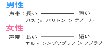 男女の声域を声楽で表わすと、男性では低いほうから順にバス、バリトン、テノール(テナー)となります。女性ではアルト、メゾソプラノ、ソプラノと区別されます。この区別も声帯の長さと張力 で決定されます。