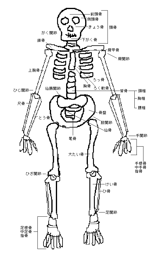 206本もある骨のうち、いちばん大きな骨は、腰から下ひざの上にある左右2本の大たい骨です。その長さは大人で約35〜45cmです。大たい骨は両端の関節部分が膨らみ、一方は股に、もう一方はひざの関節にあたり、体重を支えるとともに足を大きく動かします。 いちばん小さい骨は、耳の中にある耳小骨です。つち骨、きぬた骨、あぶみ骨の3つからなり、鼓膜で受けた音の振動を、音を識別する内耳に伝えます。