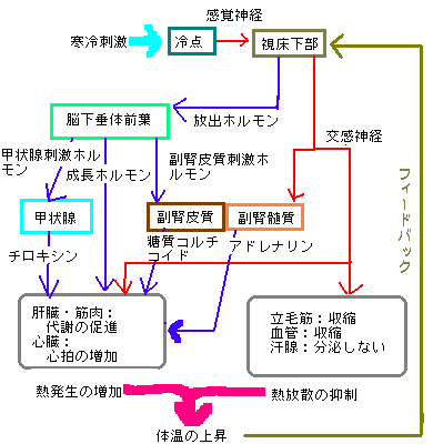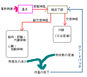 外界の温度が低いとき 外界の温度が高いとき 恒温動物ではホルモンと自律神経が協調して働いて、(1)代謝や心拍などによる熱の発 生を調節、(2)汗や体の表面からの熱の発散を調節して体温を一定に保っています。 汗腺の発達していない犬や猫では、呼吸を速めて熱を放出したり、体の表面をなめ てその水分の気化熱を利用して体温を下げたりしています。