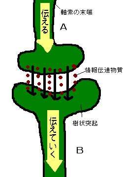 Aのニューロンの神経線維の末端が伸びていって、Bのニューロンの 樹状突起にたどり着きます。ところが、神経線維の末端と樹状突起は接 していません。