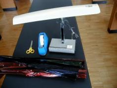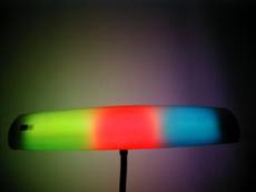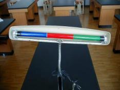 ・写真のように、色セロファンをそれぞれ1/3ずつ蛍光灯ランプに巻き付け、セロテープで固定します。