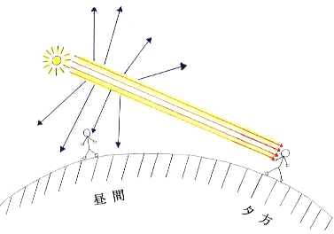 一方、夕方に太陽の方角を見ると空は夕焼けで赤っぽく見えます。これは、この場合の光が薄い空気層を斜めに進んでくるため、非常に長い距離を通ることになり、その間に青や紫の光があちこちに散乱されてしまい、残った赤を多く含んだ光が目にはいるからです。