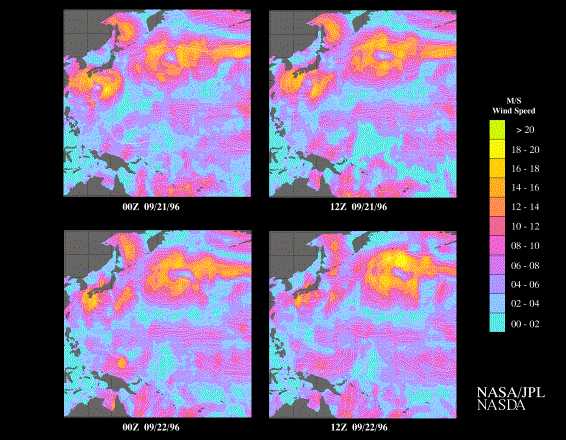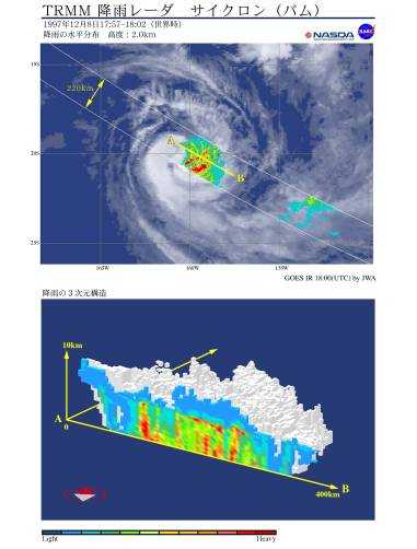 12月8日17時57分18時02分(世界時)に、TRMMが台風(パム)の中心付近を観測した時の降雨強度分布を示しています。上の図は高度