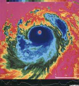 1987年8月26日に台風を可視熱赤外放射計(VTIR)の熱赤外チャンネル(波長11.5?12.5μm)で観測した台風の雲の渦の画像です。この図は、温度の低い部分は雲が高く積もっていると考えて構いません。真ん中でぽつんと温度が高くなっている部分が台風の目です。ここだけ雲がなく、海面が見えていることを示しています。温度が下がるに従い、雲の厚さも薄くなります。つまり、色が濃い部分の方が強く雨が降る事をこの図は示しています。