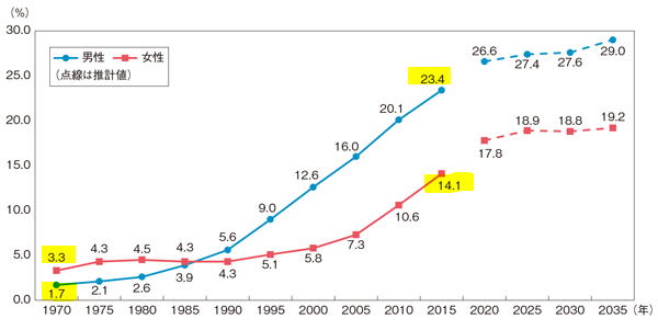右の図は、男女の50歳時の未婚率の推移を示したものです。1970年には男1.7%、女3.3%だったのが、2015年では男23.4%、女14.1%と飛躍的に増加しており、今後の一層の増加も懸念されています。 |