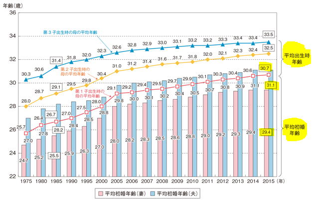 右図の上の赤い折れ線グラフは女性が第一子を産んだ平均年齢です。1975年は25.7歳でしたが、2015年は30.7歳と5歳も上がっています。 |