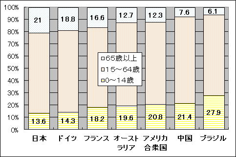 右の図は、2005年の国民の人口割合を諸外国と比較して作成したものです。諸外国と比較して日本の少子化の進展度合いを見てみるとブラジルは14歳未満の人口割合が27.9%に対して日本は13.6%とその半数以下の割合になっており、事態は深刻化しています。