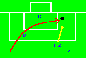 (1)Fが出したパスを、Bは場所を移動して受けた。F2がボールを受けた場所は、オフサイドポジションだが、Fがボールをプレーした瞬間にはオフサイドポジションにいなかったので、オフサイドではない
