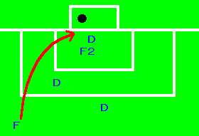 (2)Fがシュートして、ボールがゴールに入った。F2はゴールキーパーのすぐ前に立っていた。F2はオフサイドポジションにいて、積極的にプレーにかかわり、相手側競技者に干渉したのでオフサイドとなり、得点には認められない。