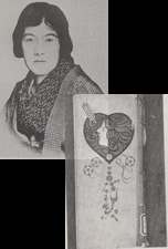 明治四十年代から大正期にかけての歌集・詩歌集に、「常夏」「佐保姫」「春泥集」「青海波」(せいがいほ)「夏より秋へ」「朱葉集」「火の鳥」「太陽と薔薇」などがあるまろ。昭和に入ってからも作歌活動は続き、「心の遠景」「白桜集」(遺稿)などの歌集が出版されている。また、日露戦争の時に「君死にたまうことなかれ」をはじめとする詩や小説、童話だけでなく、源氏物語などの古典研究、婦人問題に関する評論活動、文化学院をよりどころとした女子教育など、多方面にわたって活躍したまろ。 右が「みだれ髪」の表紙だまろ。ハートに矢が刺さって血がしたたり、それが文字を作ってとてもきれいだまろ。 |