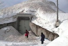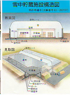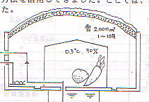 ブルドーザーで運んできたりする 溶けた雪はこの倉庫の下に貯蔵される これからお酒を、5月には山菜を入れます 除雪した雪をここで生かせます