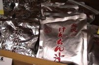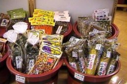 湯之谷(ゆのたに)村一帯は長寿(ちょうじゅ)の村として有名です。その長生きのひけつがえごです。原料のえご草は海そうの一種で、乾燥(かんそう)してあるので保存がきき、山間部では利用度が高い。