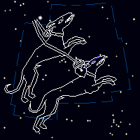 森の妖精カリストとその息子アルカスは、ゼウスの妃ヘーラ女神の呪いを受けて熊に変えられてしまいました。りょうけん座は、熊に変えられるまえにアルカスの連れていた、アステリオンとカーラという二匹の猟犬たちの姿と伝えられ、大熊に向かって激しく吠え立てています。大熊と小熊の尾が長いのは、ゼウスが空に上げるときに、慌ててしっぽを持ったためだと言います。ところが、カリストとアルカスが天に上がってからもヘーラの怒りは収まらず、二人は地面の下で休息することを許されず、北の空で回っているのだと言います。