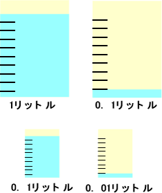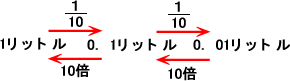 小数は1よりも小さい数を表すのに使われます。たとえば1リットルを10等分した1つ分のかさを0.1リットルといいます。おなじように0.1リットルを10等分した1つ分のかさを0.01リットルといいます。この関係を表すと、