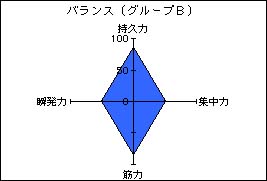 左の図を見ると分かるように、持久力と筋力が飛び抜けています。このグループは最初のスピードを保ちつつ、ラストスパートをかけなくてはいけなという競技が集まったグループです。持久力、筋力ともに鍛えなければなりません。 |