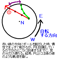 コマのように回転している円の上を、ボールを転がしている状態を想像してみてください。