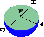 球の中心・アを通る、直線・ウ〜エのことを、球の直径、