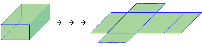 上の図のように、直方体(もしくは立方体)の箱を切り開いて、 面がつながったまま一枚の紙になるようにすることを、てん開といい、 それを紙にかいた図(右の図)のことをてん開図といいます。