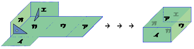 組み立てたとき(左の図)、面カと面エは垂直です。