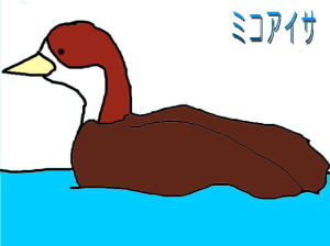 ミコアイサは潜水ガモ類で、頭からくるりと水に潜って魚を捕ります。水面に浮かんでいる時は淡水ガモよりも体が深く沈んで見えます。警戒心が強く、人間が近づくと逃げます。オスはパンダみたいな模様をしていることから、パンダガモの異名を持っています。メスきれいな茶色をしています。
