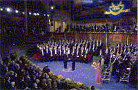 | 授賞式が終わると晩餐会が行われ、受賞者は、そこの演壇で何か味のある話しをしなければならない決まりになっています。3分枠ですが、長くなるのが普通です。続いて、舞踏会が行われます。しかし、ダンスは田中耕一氏だけでなく、ほかの受賞者も不得意とする人が多いので、中にはダンスのレッスンをわざわざ受けるという受賞者もいるそうです。しかし、この晩餐会と舞踏会の参加を辞退した受賞者もいます。1903年受賞のキューリー夫妻と1973年受賞のマザー・テレサです。キューリー夫妻の場合、大学の授業を理由に辞退し、マザーの場合は、「そのような贅沢をするなら貧しい人に寄付してほしい」といって辞退しました。
