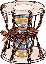 両面に牛の皮が張られていて、それを左右から「ばち」で打ちます。鞨鼓は音楽のテンポとリズムを決定するため、全体のリーダー格の奏者が担当しました。