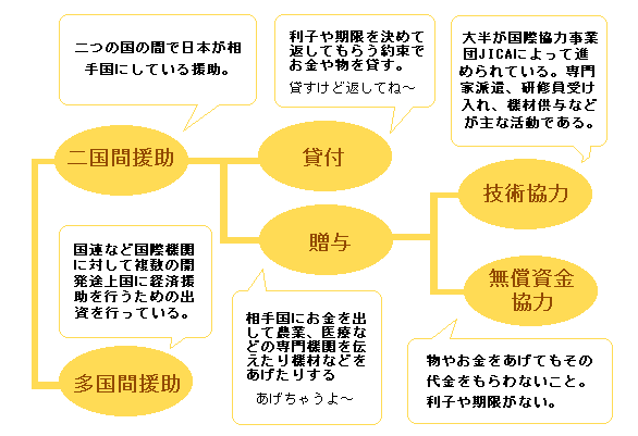 、さっそくですが政府開発援助ODAって機関なんですか? ははは、ODAは機関の名前じゃないんだよ。政府開発援助ODAというのは政府を基準として開発途上国に経済協力をすることをいうんだ。 ええ?!そうなんですか。ぼくはてっきりODAっていう名前の機関があるのかと思っていました。 ODAはね、社会の発展や国民の福祉向上、民生の安定に協力する先進国の援助なんだ。 ふむふむ、なるほど〜 つぎは国際協力事業団JICAについて説明しよう。 BACK NEXT